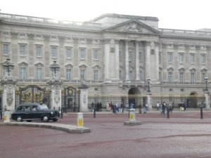and bright blue skies revealed themselves. It was glorious! We found a small cafe’, got some tea (hot chocolate for Sarah), then sat and scalded our tongues (boy, do they mean HOT tea over here!). Lifting an item from Friday’s must-see list, we decided to take the bus to Hyde Park Corner to see the Wellington Arch and walk back past Green Park, Buckingham Palace, and St. James’s Park. The weather had turned quite nice, and we thoroughly enjoyed our walk, though by now my left knee was very stiff (from our climb to the top of St. Paul’s). I limped along well enough, and we took some shots of Buckingham Palace and a darling cottage within St. James’s wildlife preserve: