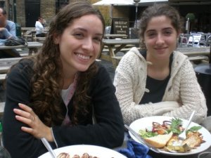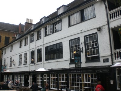 Now thoroughly hungry from our climb, we decided it was time to head to The George Inn over the Thames in Southwark (SUTH-ark). We wanted to see this, because it was one of Charles Dickens’s favorite haunts and figures as a coaching inn in The Pickwick Papers. We made our way down Queen Victoria Street and over the Millennium Bridge to Bankside. From there, I did my best as intrepid leader to follow the map we had to the George. Another word to the wise: London directions are never accurate, whether given by a person or a computer! We went this way, then that, trying to figure out what street we’d crossed and going down several blind alleys before we finally located Borough High Street. Obeying the map, we turned right and walked what must have been 1/3 mile before despairing of ever finding the inn! We finally turned around and headed in the other direction. One block past the street we’d turned from was The George–it was a left turn rather than a right! By now, it had taken us nearly 1.5 hours to walk to get our lunch, we were footsore and starved. Thankfully, the George does serve lunch! Here are Lindsay and Sarah enjoying a delicious luncheon: