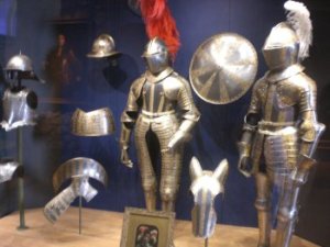 We spent two hours exploring the Tower complex (it’s really several towers within a castle wall) with no crowds. We made a beeline to the Crown Jewels right off–but no photos allowed…sorry! Then we headed to the White Tower, which contains the armory. I’ll have to post lots more pictures later. For now, here is one of the armor made for two young princes. Boys as young as seven learned to carry themselves and wield weapons in armor! The armory is crammed from top to bottom with weapons and armor (including horse armor), effigies of kings created for a great exhibition in the 1600s, and beautiful displays of gilded decorations from royal ships. I shot lots of photos for my boys!