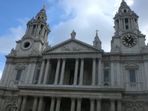 After seeing the “Bloody Tower” and walking around the large green square (where several people were beheaded–ugh), we made our way to St. Paul’s Cathedral. No photographs were allowed inside, but I took many of the outside. Here is one that shows the immense towers on either side of the front entrance: