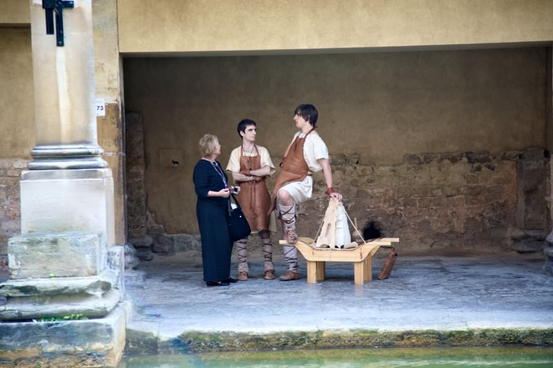 Several street performers were in the Abbey yard next to the Pump Room, including a one-man band, two “living statues,” and a gent doing stunts with a unicycle and juggling flaming torches! We watched for a while as we waited for our group to gather. At the last minute, my husband realized he’d left his hat in a vintage clothing shop several blocks away, so I offered to go back for it while everyone else went through the Roman Baths (I got to see them in March). Here you see our group gathered in the upper hall next to the Pump Room, which affords a bird’s-eye view of the Baths. Several opted to take the audio tour, which is fascinating to listen to. Below are Lindsay’s shots from the tour: