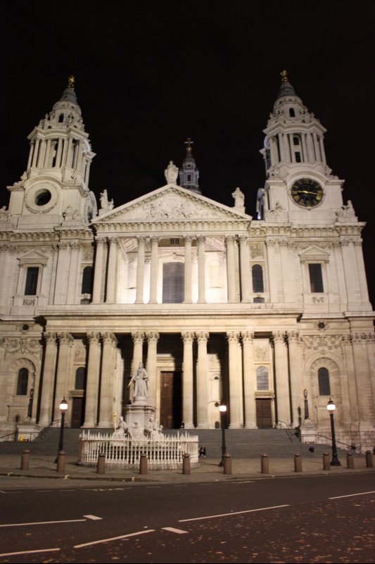 Part of my group walking up towards St. Paul’s…The front of St. Paul’s all lit up at night…The majestic front of St. Paul’s with the statue of Queen Anne looking over the city…