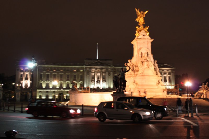 We continued down past the Houses of Parliament and Westminster Abbey. I missed my first turn back up toward St. James’s Park and took us on a two-block “detour” (oops!), but we enjoyed navigating through some pretty and quiet side streets before once again hitting St. James’s Park and turning north towards Buckingham Palace. At this point, Jenny, Nancy, and Stephanie had to bid us adieu and rush back down to Westminster Bridge to cross over to the London Eye, as they had tickets for a ride at 8:30pm. The rest of us forged onwards, skipping walking through the darkening park and instead skirting ’round it to reach the palace.