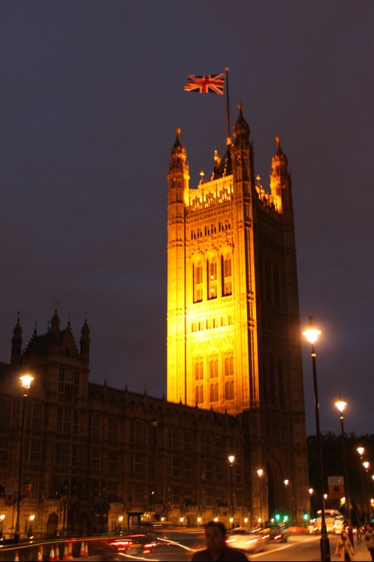 I had promised to do an evening “dash” around my favorite places in London with any ladies willing to get their walking shoes out and keep up the pace. So after checking in and stowing our bags, a group of us headed out of the hotel for the Gloucester Road tube station to commence our little expedition. Our first stop was the St. James’s Park underground station. We hopped out and walked the short distance down to Westminster Abbey and the Houses of Parliament, stopping just long enough to take a few pictures. You will have to forgive mine here — they are definitely “impressionist” views of evening London, as I am no expert with this new-fangled camera and all its settings…nor do I have the ability to hold my breath through long shutter exposures! 😉 As you can see, the sun had set, and the amazing blue of the evening sky made a breathtaking backdrop for the cathedral.