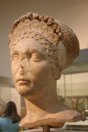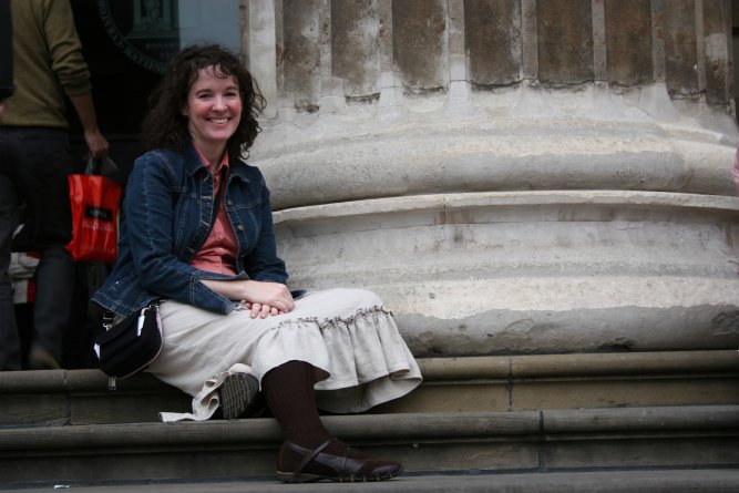 After browsing the fashion exhibit, we headed into the wonderful British galleries (1500-1780s), Bria stopping to snap lots of pictures. After that, we walked over to the medieval galleries, which were in the midst of being revamped. The only place open was the plaster cast room, which contains life-sized replicas of some of the most famous sculptures (pagan and Christian) in the world. Many were breathtakingly huge, and we wondered how on earth they were placed in the room! An artist was in this room with a large sheet spread out on the floor, sketching the exhibit in charcoal. Her work was really spectacular. Along one side of the gallery were many casts of tomb effigies from the 12th and 13th centuries: