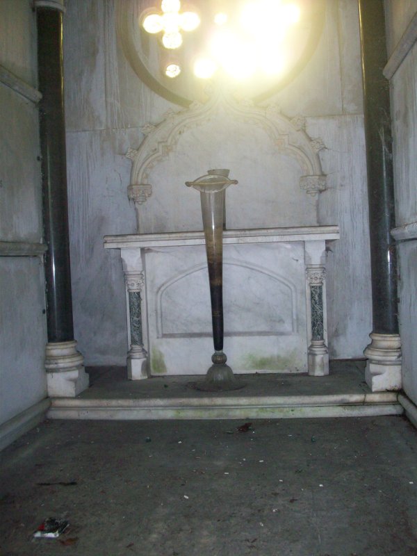 As you can see, the glass has been broken out of the bottom of the door behind the floral design–a great pity. This must have occurred many years ago, as no traces of glass remain inside the tomb. You can see what the glass used to look like in this detail shot of the upper door: